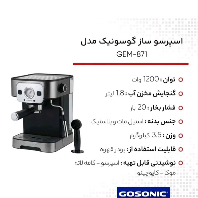 اسپرسو ساز گوسونیک مدل 871GEMسیستم گرم کردن فنجان نوشیدنی های قابل تهیه اسپرسو .کافه لاته کا.کاپوچینو . 20بار گنجایش مخزن آب 1.8لیتر 1200وات.واقعی دارای سینی چکه گیر جداشونده بخار جهت تهیه فوم قهوه 1200وات ساخته شده از استیل مات وپلاستیک دارای پیمانه و تمپر پلاستیکی (مشتری گرامی لطفاً قبل از ازموجودی باخبر شوید پیام دهید یا تماس بگیرید ممنونم ازتون) (09337493884) غفاری کن ساز