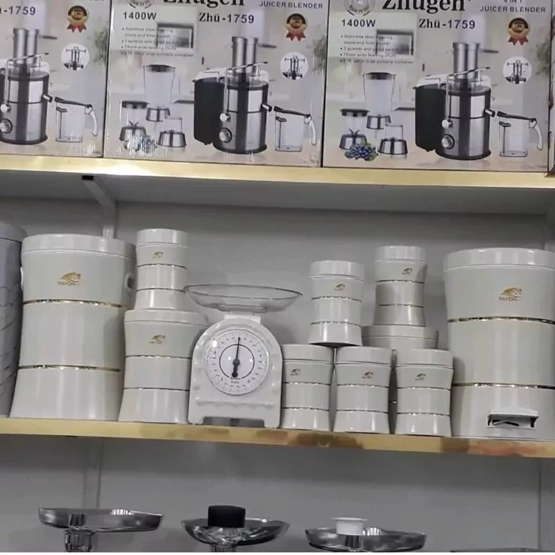 مشخصات ست ظرف نان و بنشن: - یک عدد ظرف نان - ابعاد ظرف نان: 17.5 × 24 × 43.5 سانتیمتر و وزن 1609 گرم - ظرف نان دارای درپوش آسان بازشو و مناسب برای نگهداری از انواع نان - 3 عدد بانکهها دارای درپوش از نوع چفتی - ابعاد هر بانکه: قطر 11.5، ارتفاع 16.5 سانتیمتر - وزن 375 گرم - کف بانکهها دارای لایهای لاستیکی برای جلوگیری از سُر خوردن از روی سطوح مختلف - بانکهها مناسب برای نگهداری از قهوه، شکر، چای، قند و... مشخصات بانکه کوچک: - تعداد: 3 عدد - ابعاد: قطر 11.5 و ارتفاع 9 سانتیمتر - وزن ظرف: 207 گرم - دارای درپوش فلزی مشخصات ظرف بانکه متوسط: - تعداد: 3 عدد - ابعاد: قطر 17.5 و ارتفاع 20 سانتیمتر - وزن: 715 گرم - دارای درپوش فلزی مشخصات ظرف حبوبات بزرگ: - تعداد: 1 عدد - ابعاد: قطر 27.5 و ارتفاع 23 سانتیمتر - وزن: 1515 گرم - دارای درپوش فلزی مشخصات ترازو: - ابعاد: قطر 22.5 و ارتفاع 30 سانتیمتر - قطر کاسهی ترازو: 22.5 سانتیمتر - وزن 650 گرم - دارای پیچ تنظیم عقربه (صفر کردن) - قابلیت جدا کردن کاسه - جنس ترکیبی از پلاستیک و فلز مشخصات ست ملاقه: دارای 6 عدد ابزار آشپزی به همراه استند - ارتفاع استند: 37.7 سانتیمتر - وزن: 443 گرم - جنس: پلاستیک مشخصات ست جای ادویه: - شامل 6 عدد جای ادویه - ارتفاع هر ظرف ادویه: 10.8 سانتیمتر - قطر دهانه: 5 سانتیمتر - وزن هر کدام: 90 گرم مشخصات ظرف برنج: - ارتفاع: 36.3 سانتیمتر - قطر سطح مقطع: 27.5 سانتیمتر - دارای قسمت جای دست - دارای پیمانه پلاستیکی - ظرفیت: 18 کیلوگرم مشخصات سطل: - ارتفاع: 42 سانتیمتر - قطر سطح مقطع: 29 سانتیمتر - دارای پدال - گنجایش: 20 لیتر - دارای دستگیره - دارای قابلیت جدا کردن سطل داخلی - دارای در فلزی مشخصات ظرف ماکارونی: - ارتفاع: 25 سانتیمتر - قطر: 11.5 سانتیمتر - وزن: 560